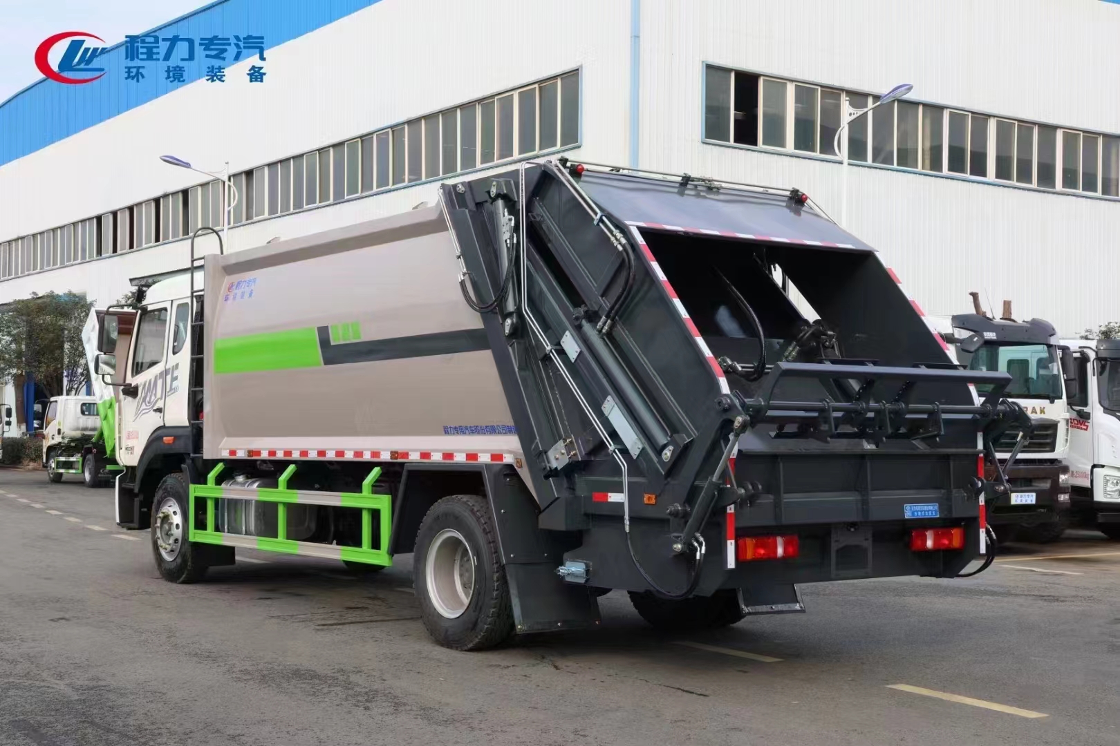| 上裝配置 | 整車上裝箱體采用高強度鋼制作,容積約16/18立方,新式可破碎刮板,后置污水箱,雙向蠕動壓縮,國內知名品牌液壓系統(tǒng),恒力油缸,中梅多路閥,嘉善取力器,合資品牌睿辰鐵殼齒輪泵,駕駛室內及車身外集中CAN電控系統(tǒng),尾部可選裝掛桶翻轉機構,帶氣動后蓋,可實現(xiàn)垃圾桶的翻轉傾倒上料,亦可選裝擺臂裝置、三角斗裝置、大落地全密封斗裝置等進料裝置。壓縮比高,液壓系統(tǒng)穩(wěn)定可靠,高品質、高性價比! | ||